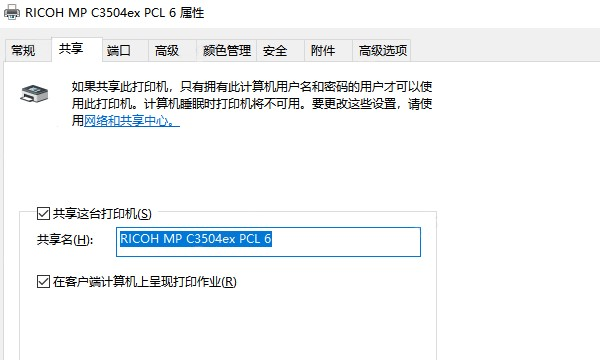 2、可根据需要修改共享名称,例如:RICOH MP C3504ex PCL 6